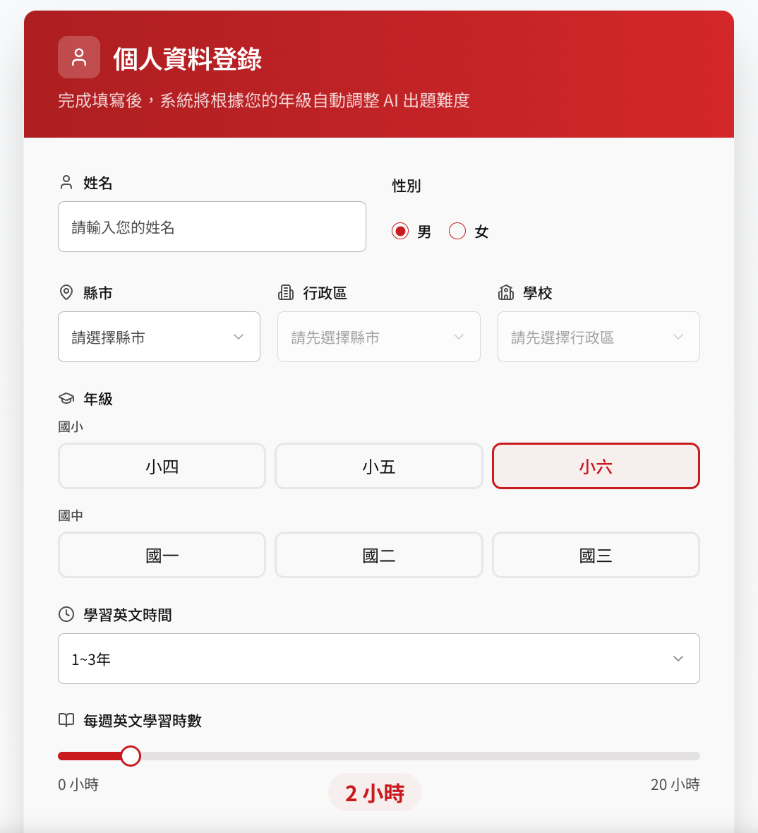 1. 動態參數化命題(Parametric Scripting): 系統會要求被檢測者輸入三個關鍵變數:「目前就讀年級」、「英語學習年限」、「每週接觸英語時數」。AI 會根據這三個維度,在 30 秒內從教育部 2000 單字庫中,即時演算出難度最適中的 40 道題。這意味著,每個孩子拿到的都是一套「量身定做」的診斷。
