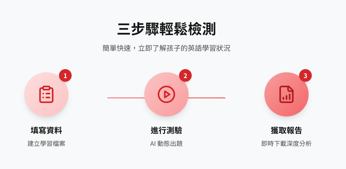 我們提供國際 CEFR 標準與台灣會考等級的報告,對孩子的英語學習規劃安排轉化為理性的「我看見了學習路徑」、「我的孩子應該如何調整學習方法」。