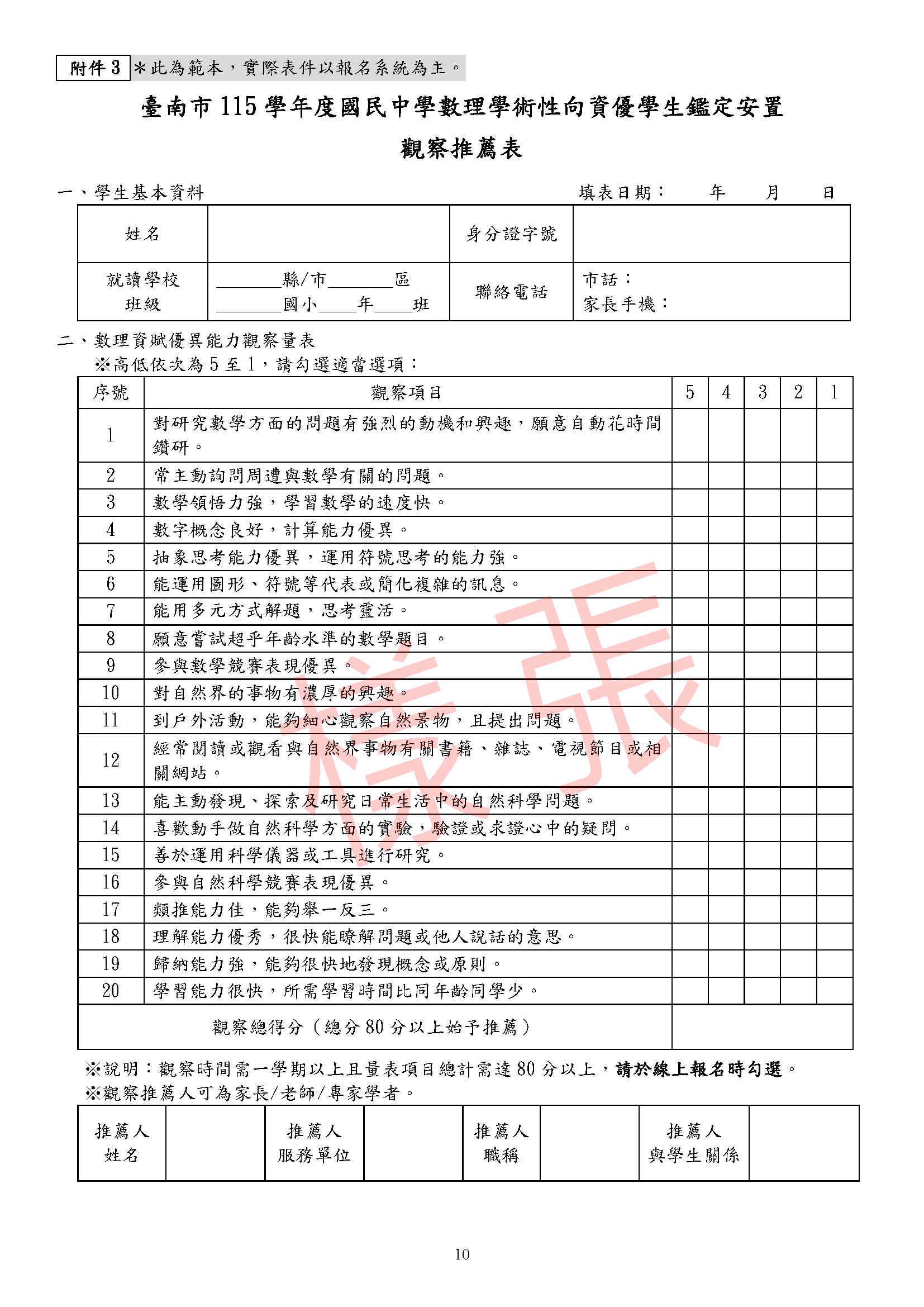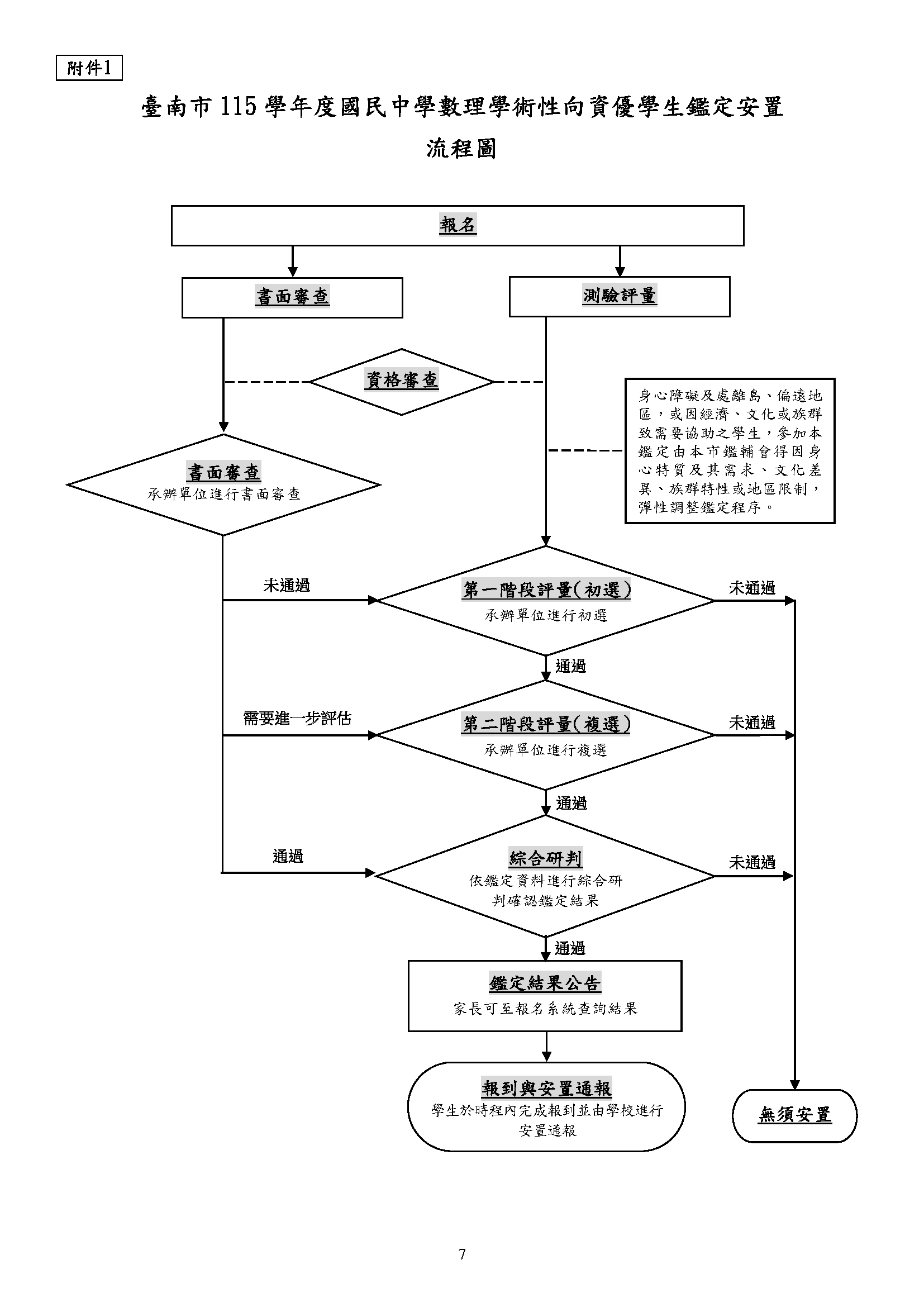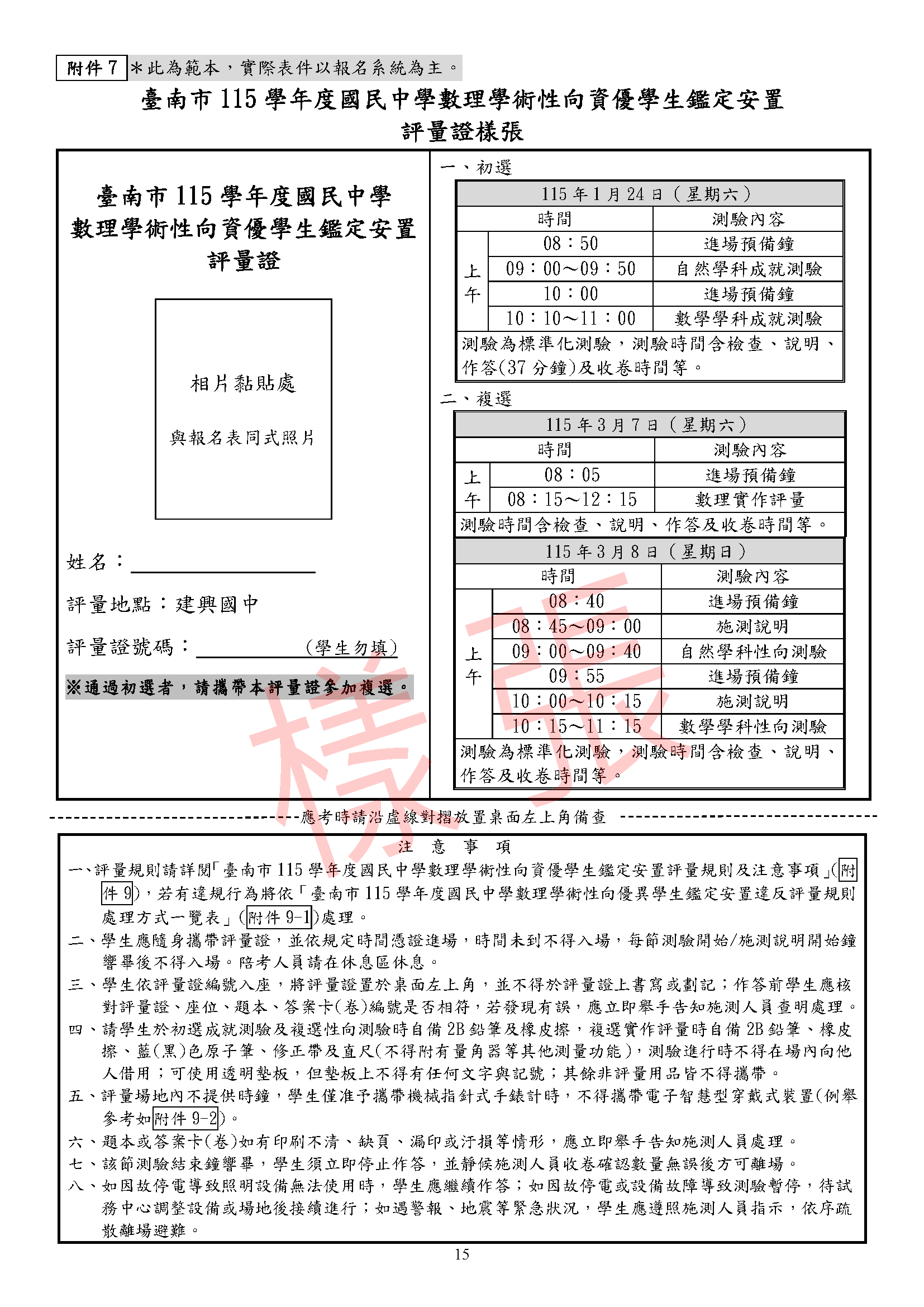 臺南市115學年度國民中學數理學術性向資優學生鑑定安置重要日程表