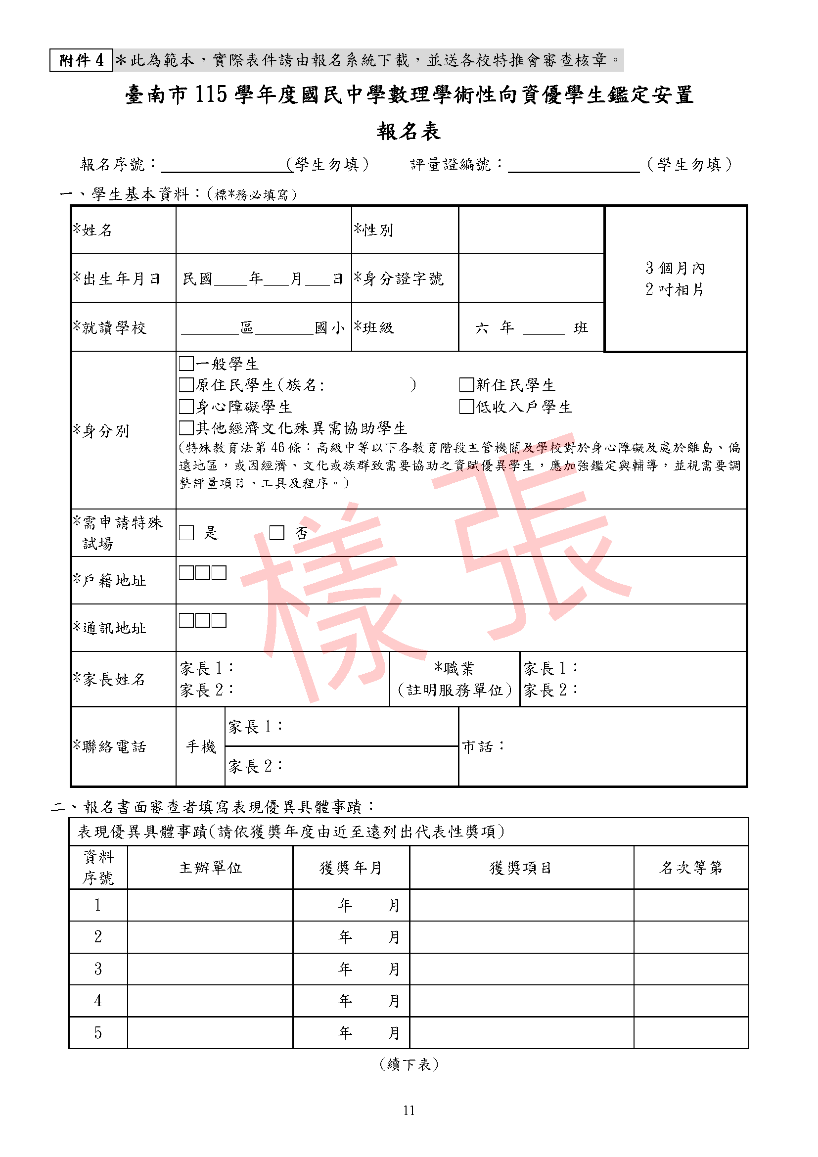 2.請於鑑定報名專區勾選報名身分資格送出後並填畢下列各項資料: 🌟(1)報名測驗評量者: A.觀察推薦表(附件2),總分須達標準(80分)。 B.報名表(附件3),須上傳3個月內2吋正面半身脫帽相片,約496*555像素)。 C.戶籍資料(戶口名簿或戶籍謄本):請拍照或掃描正本後上傳。 🌟(2)如具有減免報名費或申請身心障礙、重大傷病及突發傷病學生試場服務資格者,除上述(1)外,請再上傳下列文件: A.身心障礙證明:減免報名費或身心障礙、重大傷病及突發傷病學生試場服務者務必拍照或掃描正本資料後上傳。 B.區公所核發之低收入戶證明:申請減免報名費者務必拍照或掃描正本後上傳。 C.其他經濟文化殊異須協助之學生等佐證資料。 |